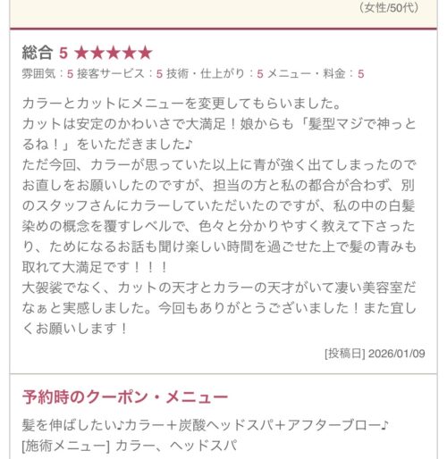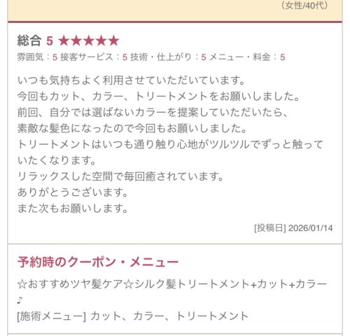ホットペッパーからご予約いただいたお客様は、口コミの投稿が可能です。
