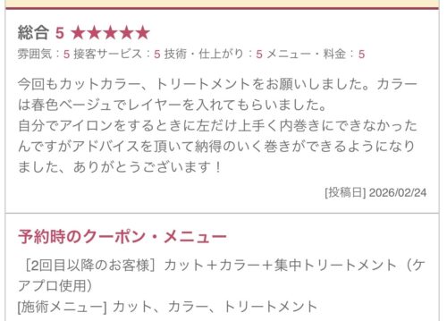 たくさんのお客様が、ご来店後にスタイルの感想やサロンでの時間について嬉しいお声を届けてくださっています。