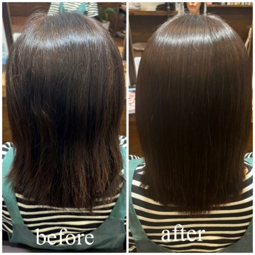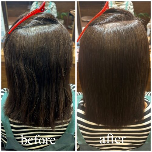 乾燥やうねりが目立っていた髪が、施術後にはしっとりとツヤのある自然なストレートに大変身!