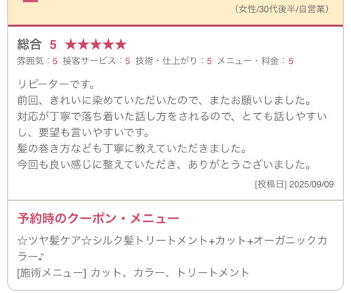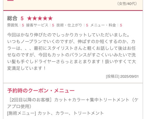 しっかりと髪に栄養が入った感じですが、サラサラしていてとても軽い仕上がりです。
