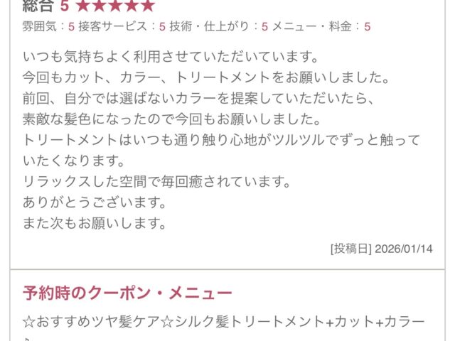 こんにちは♪ 先日、leaのスタッフと他店の美容師さんたちで新年会を行いました。 美容師にとって12月は一年で... > 続きを読む